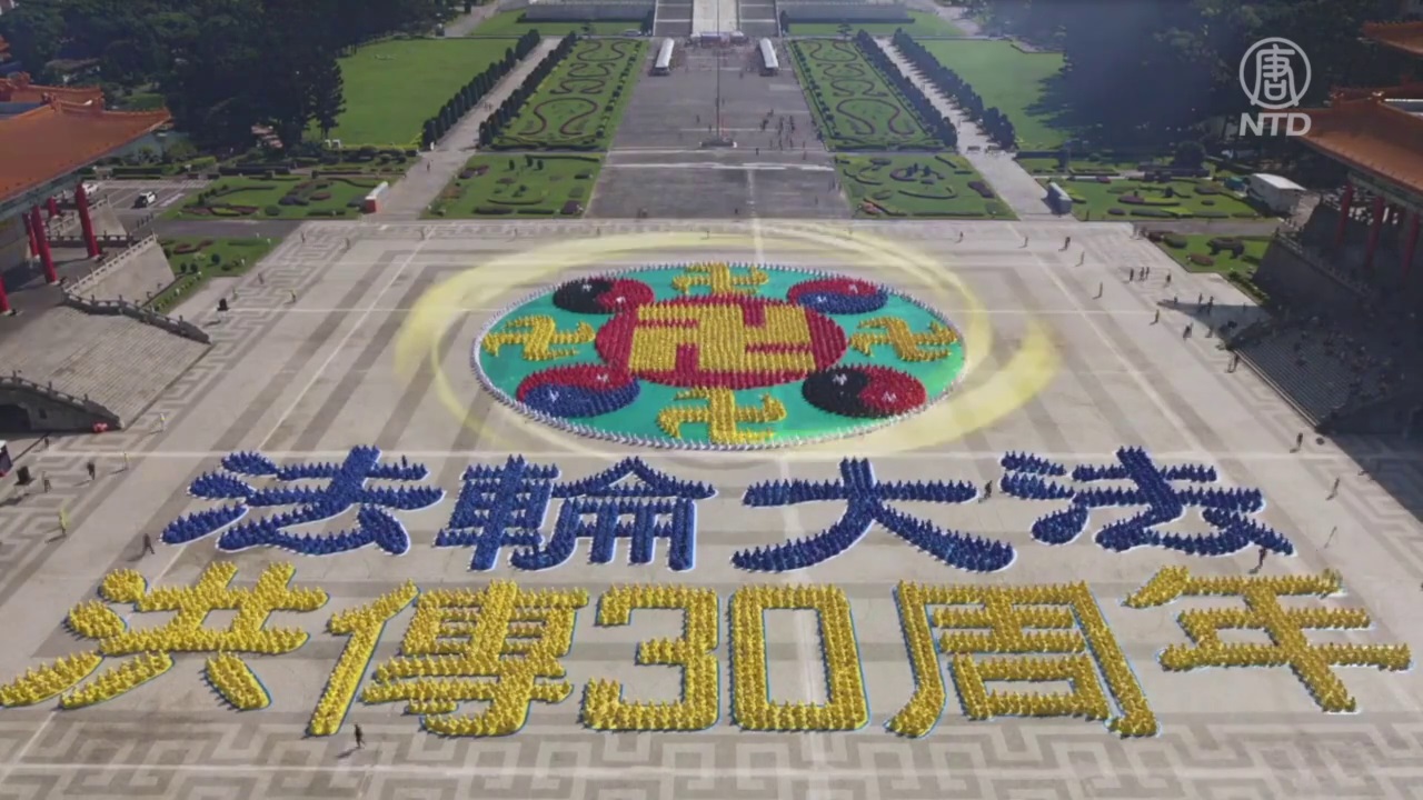台五千人排字庆法轮功洪传30年 外国游客驻足